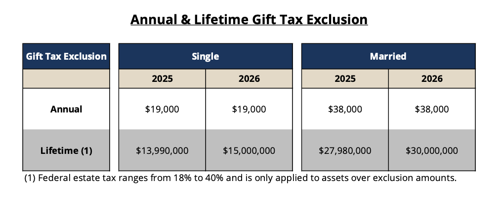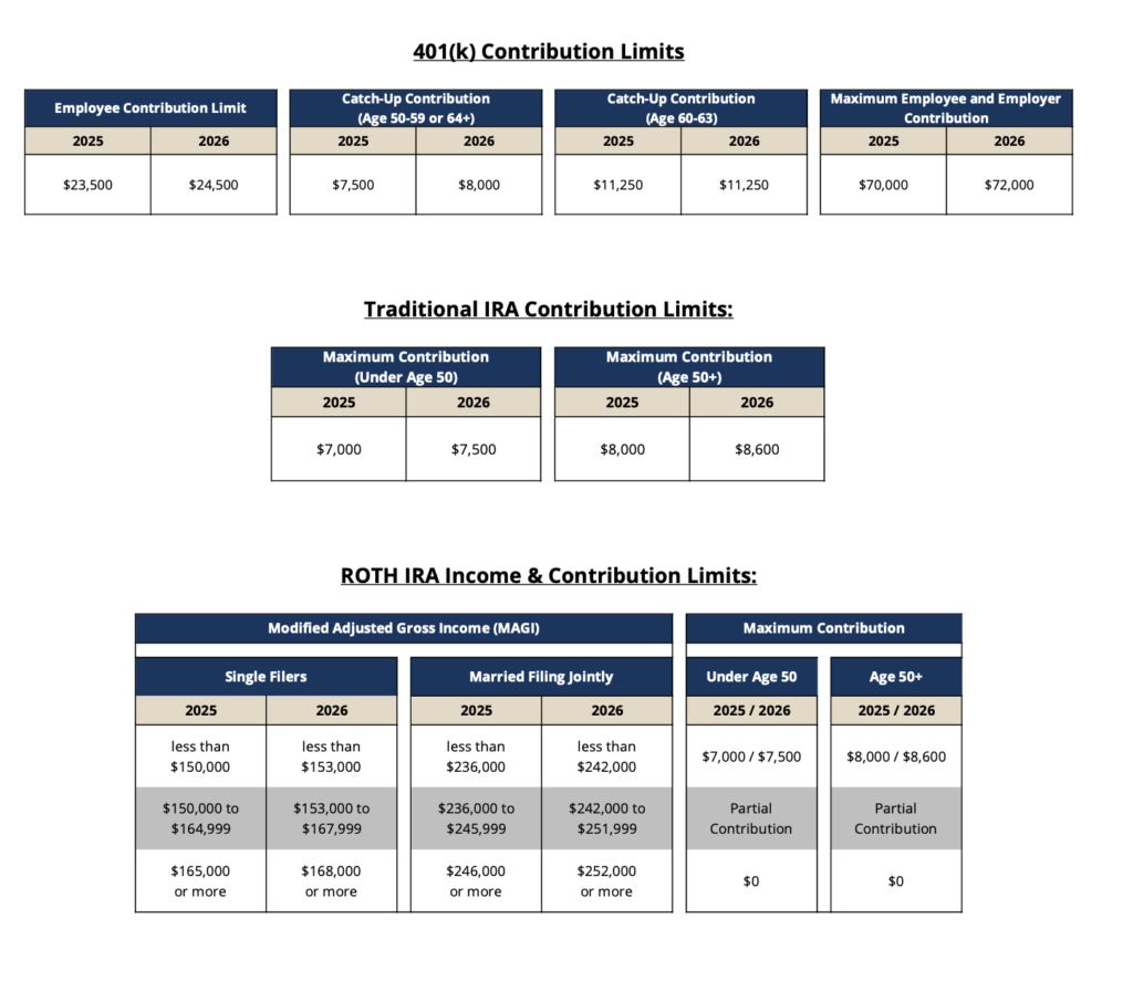As we transition from 2025 into the new year, we want to highlight important information for tax planning, including annual gift exclusions and retirement contribution limits. Traditional and ROTH IRA contributions for the 2025 tax year can still be made until April 15, 2026, allowing you to maximize available benefits.