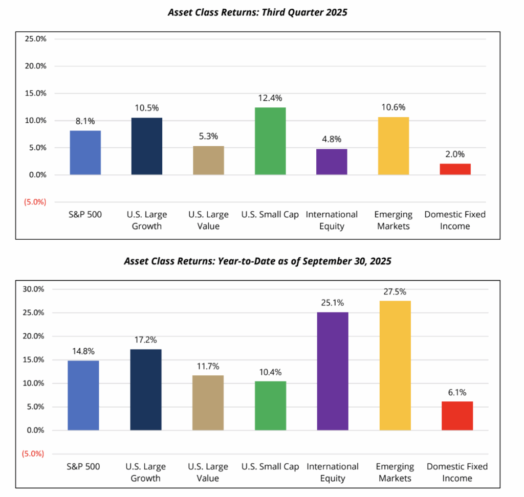 The third quarter of 2025 delivered strong returns across global equity and fixed income markets with the MSCI All Country World Index returning +7.6% (+18.4% YTD) and the Bloomberg U.S. Aggregate Bond Index gaining +2.0% (+6.1% YTD). In September, the U.S. Federal Reserve (“Fed”) resumed its easing cycle following a nine-month pause with an announced rate cut of 0.25%, bringing the benchmark for short-term interest rates to a range of 4.0% to 4.25%. The Fed’s first rate cut of the year provided a tailwind for both equity and fixed income markets, despite concerns of a softening U.S. labor market.