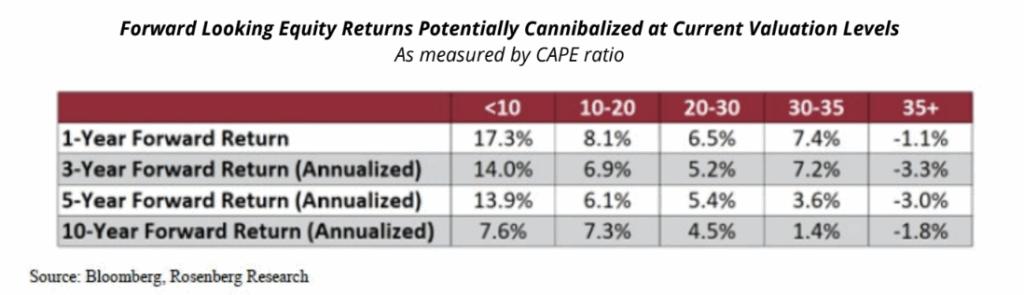The outperformance of mega-cap technology companies has also driven the continued concentration of the top companies in the S&P 500 Index. At quarter-end, the top ten companies in the index represented 40.4% of the index, an all-time high. Concerns related to elevated U.S. equity markets valuations remain, as the S&P 500 Index ended the quarter trading at a 22.8x forward price-to-earnings (“P/E”) ratio, well above its 30-year average of 17x. The cyclically adjusted P/E ratio (“CAPE”) also ended the period trading at 37.5x, near its historical high. The denominator in the calculation of the CAPE ratio is the average inflation-adjusted earnings over the past 10 years. This calculation helps account for business cycles and seeks to provide a more stable comparison of valuations across different economic conditions. The elevated valuation metrics signal potentially compressed forward-looking returns for U.S. large-cap equity indices. While past performance is not indicative of future performance, forward returns over various time periods with a CAPE ratio greater than 35x have historically been negative, as noted in the table below.